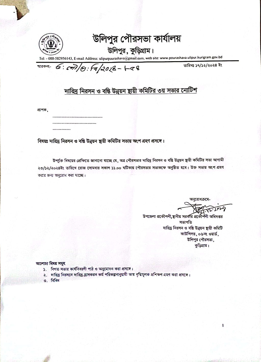 | ৯ | দারিদ্র নিরসন ও বস্তি উন্নয়ন স্থায়ী কমিটির ৩য় সভার নোটিশ | | | ১৭-১২-২০২৪ | দেখুন |